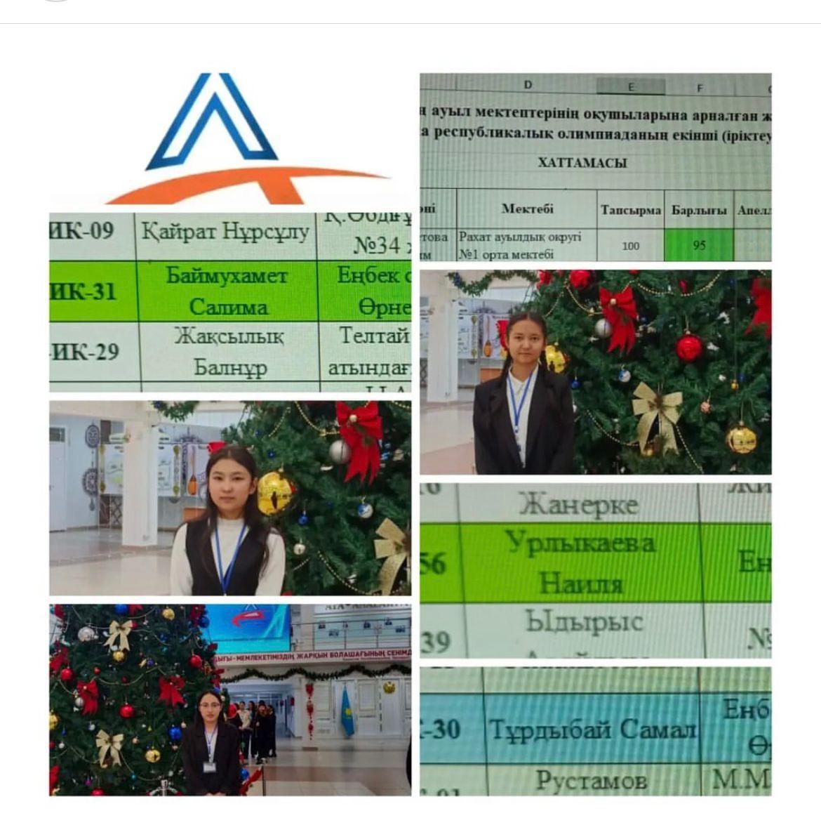 1. Баймухамет Салима - 11 Б сынып оқушысы Қазақстан тарихы пәнінен 2 орынға ие болды. Жетекшісі : Ашкеева Алуа Карибековна