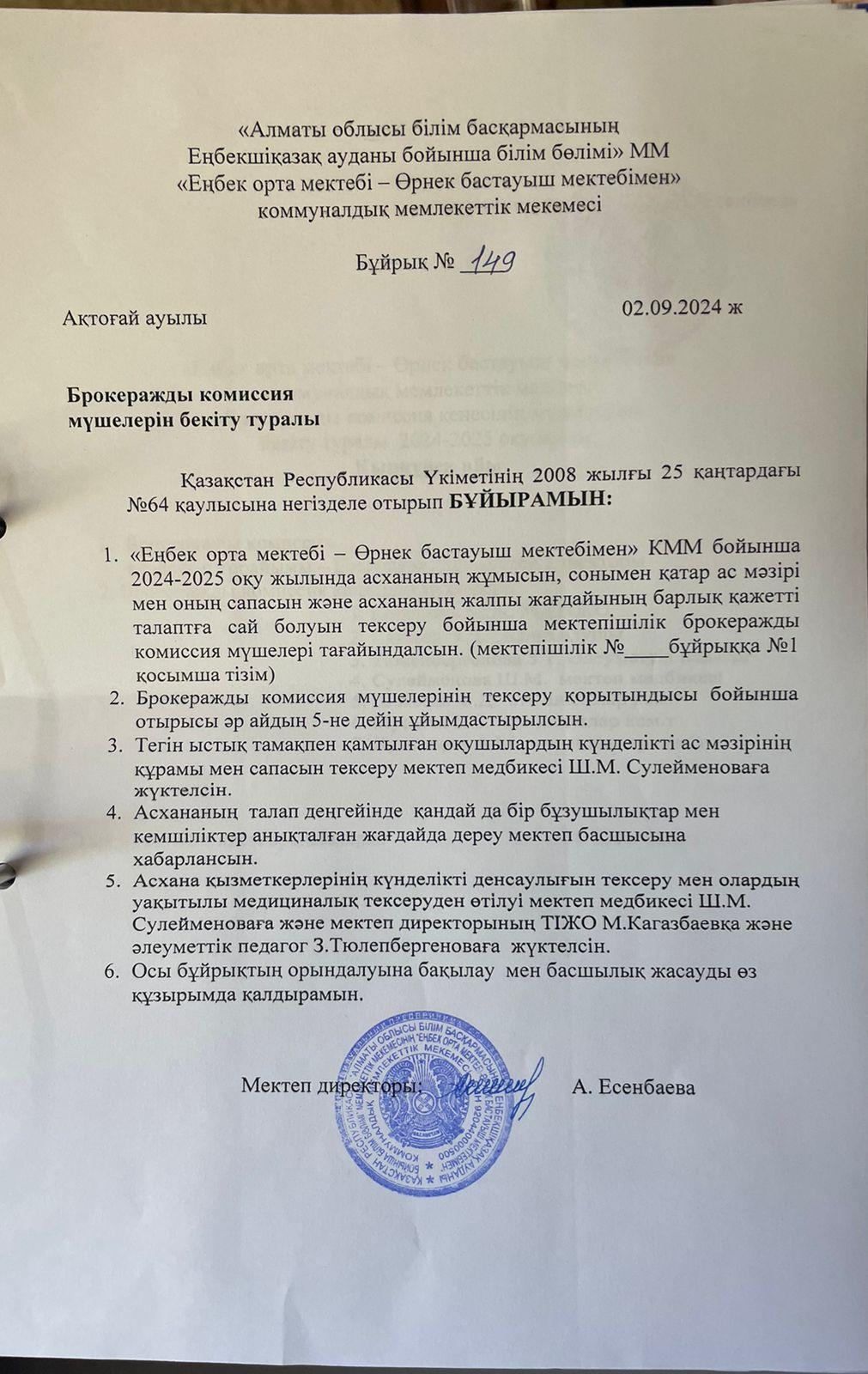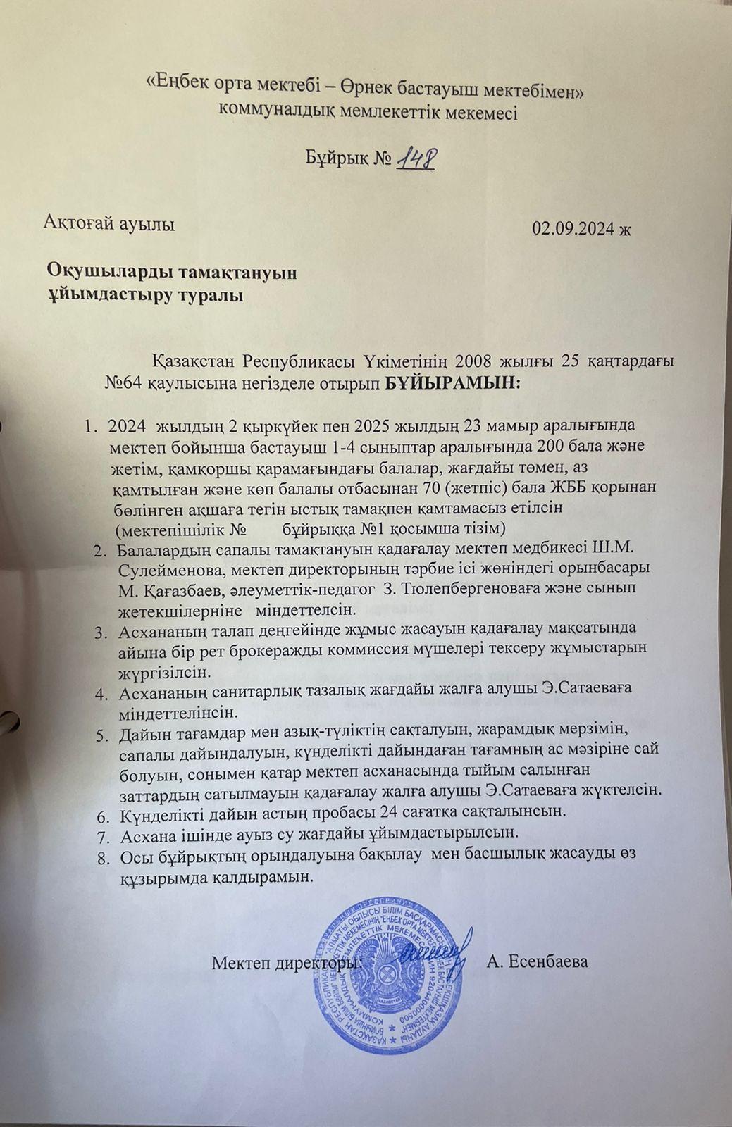 Об утверждении Правил организации питания обучающихся » Еңбек орта мектебі
